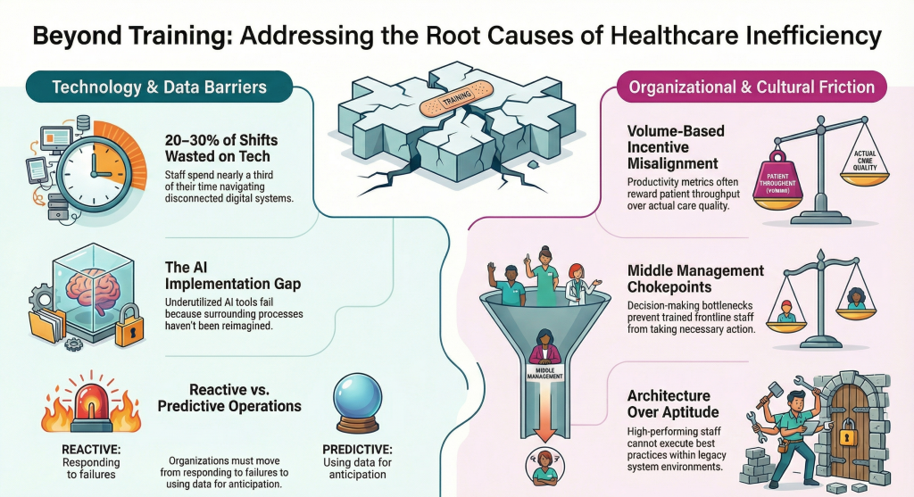 Workforce productivity in healthcare is not primarily a training problem. It is a structural one. Until leaders confront the operational, technological, and governance conditions in which their workforce operates, training spend will continue to deliver diminishing returns.